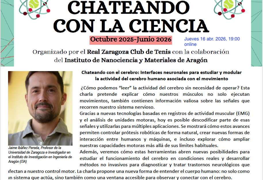 Ponente: La sesión estará a cargo de Jaime Ibáñez Pereda, profesor de la Universidad de Zaragoza e investigador en el I3A. El Dr. Ibáñez lidera un laboratorio de interfaces neuronales y es miembro de la Academia Joven de España, contando con una destacada trayectoria internacional en instituciones como el Imperial College London y el CSIC.