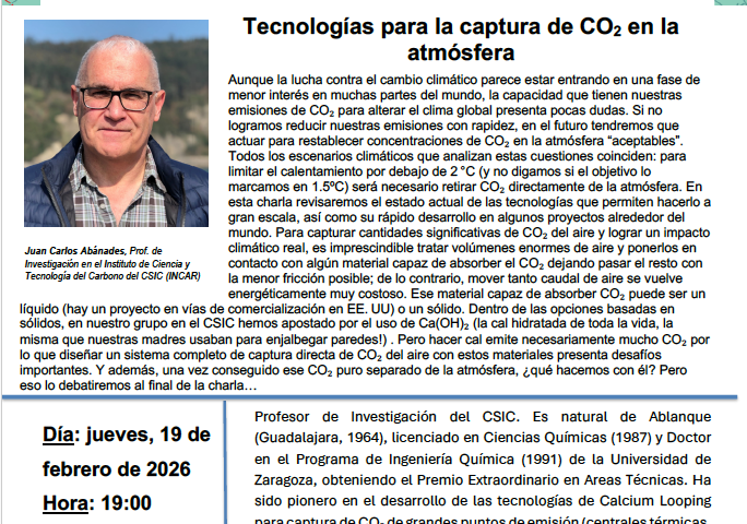 Sobre el ponente: La charla será impartida por Juan Carlos Abánades, Profesor de Investigación en el Instituto de Ciencia y Tecnología del Carbono del CSIC (INCAR). Abánades es un pionero internacional en tecnologías de Calcium Looping, autor principal de informes del IPCC (distinguidos con el Premio Nobel de la Paz en 2007) y coordinador del proyecto europeo CaLby2030.