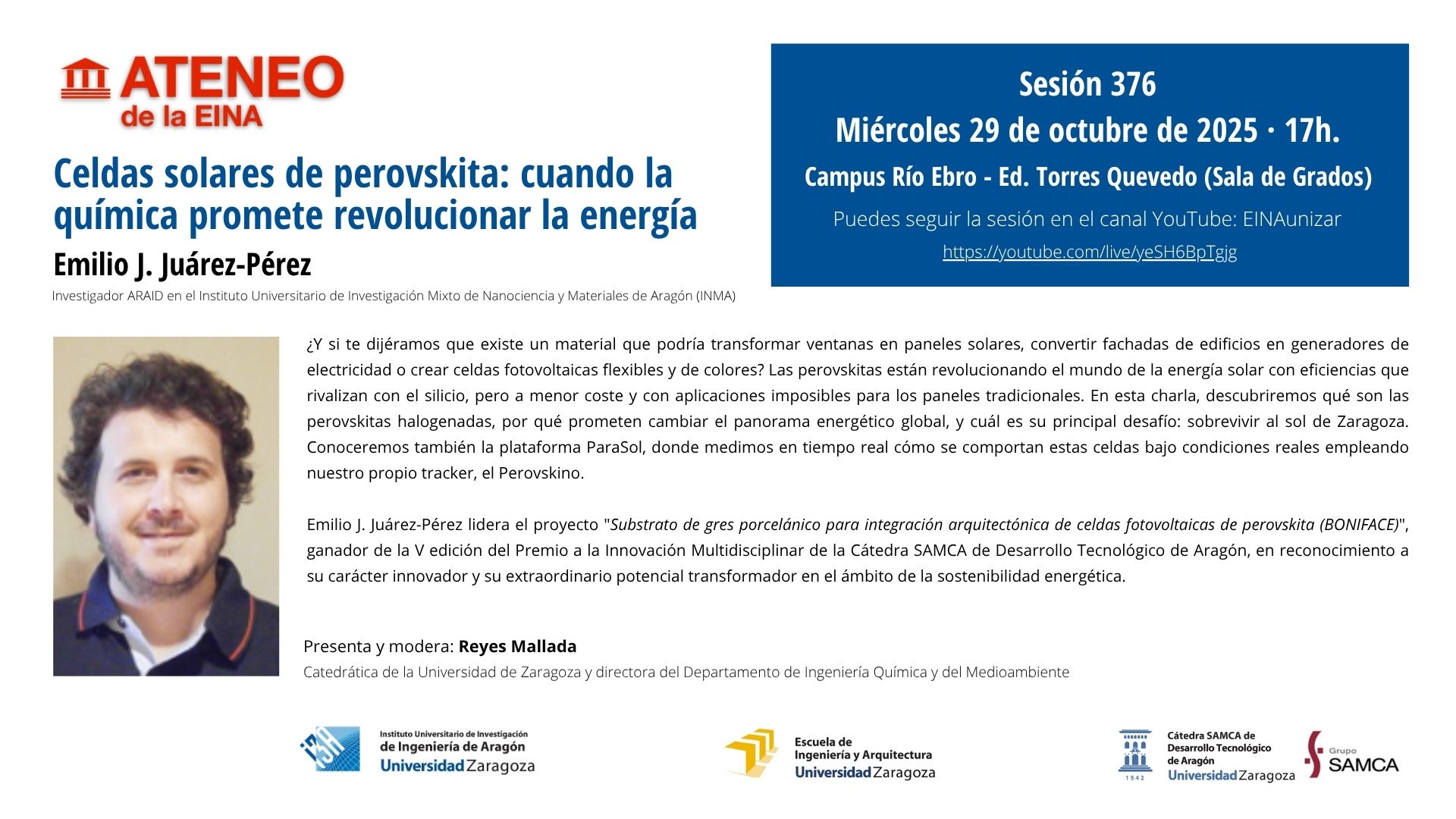 Arranca una nueva temporada del Ateneo de la EINA. La próxima sesión tendrá lugar el miércoles 29 de octubre, a las 17h., y contará con la participación como ponente invitado de Emilio J. Juárez Pérez (investigador ARAID en el Instituto Universitario de Investigación Mixto de Nanociencia y Materiales de Aragón (INMA), instituto mixto CSIC-UNIZAR.