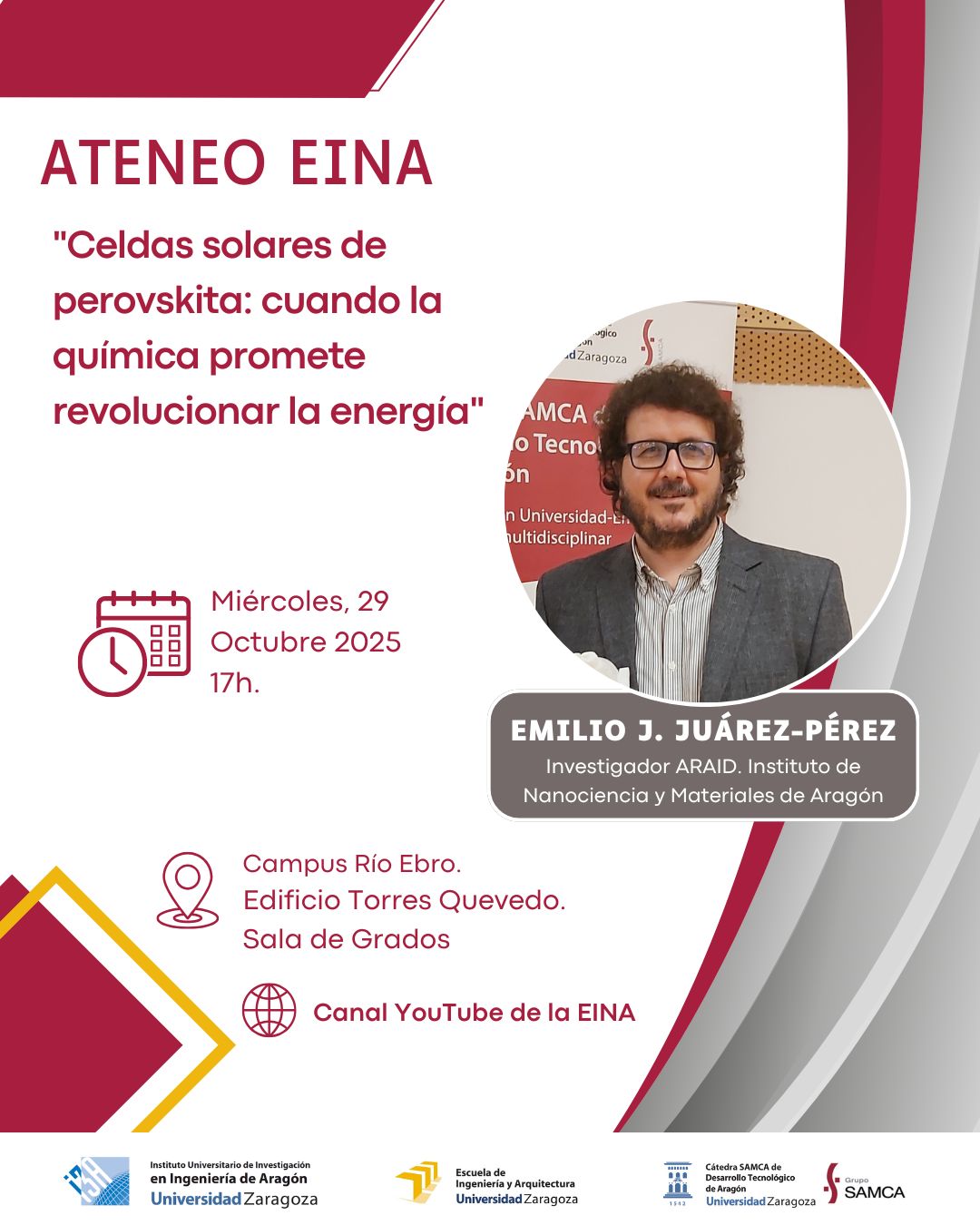 Arranca una nueva temporada del Ateneo de la EINA. La próxima sesión tendrá lugar el miércoles 29 de octubre, a las 17h., y contará con la participación como ponente invitado de Emilio J. Juárez Pérez (investigador ARAID en el Instituto Universitario de Investigación Mixto de Nanociencia y Materiales de Aragón (INMA), instituto mixto CSIC-UNIZAR.