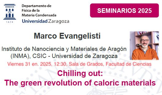 El 31 de enero dará comienzo una nueva edición de los Seminarios del Departamento de Física de la Materia Condensada de la Universidad de Zaragoza, que en esta sesión contará con Marco Evangelisti, del Instituto de Nanociencia y Materiales de Aragón, INMA, instituto mixto del CSIC y la Universidad de Zaragoza, que ofrecerá la conferencia titulada: “Chilling out: The green revolution of caloric materials”.