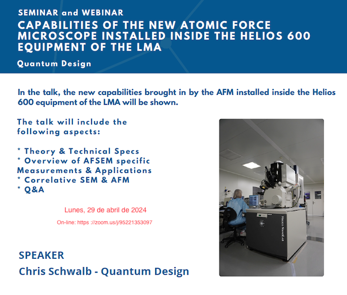 Charla: «Capabilities of the new Atomic Force Microscope installed inside the Helios 600 dual-beam equipment of the LMA»