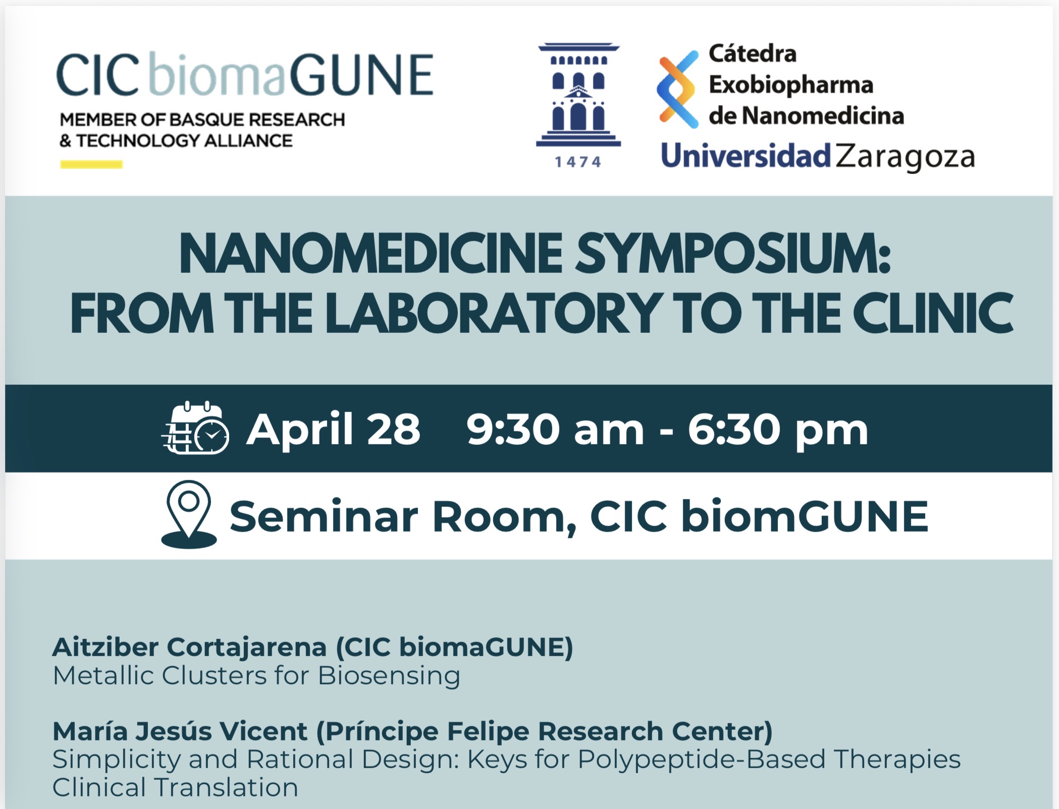 The symposium will bring together researchers working on different aspects of nanomedicine, from fundamental developments to clinical translation. The program will include talks by invited speakers from CIC biomaGUNE and other institutions, followed by a panel discussion on the clinical translation of nanomedicine.