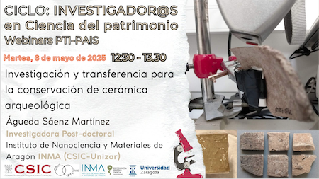 On Tue 6th May 2025, from 12:30 to 13:30, Águeda Sáenz Martínez will participate in a webinar of the PTI-PAIS Cycle of Researchers in Heritage Science with the conference entitled ‘Research and transfer for the conservation of archaeological ceramics’.