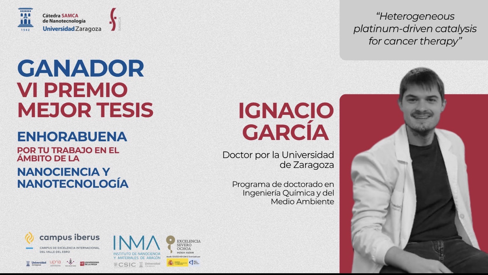El galardón ha sido otorgado a D. José Ignacio García Peiro por su tesis doctoral (desarrollada en el INMA): “Platinum-driven catalysis for cancer therapy”.